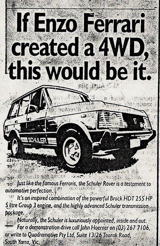 5) In an article in Outlander - November 1982 - 'From brands hatch to Cunninghams Gap - Ferguson 4WD transmission in Range Rovers') describing the history behind the development of the Ferguson 4WD system and that Quadramotive was now the Australian agent for this system.The anti-locking brake system offered from Schuler, developed by Maxaret.