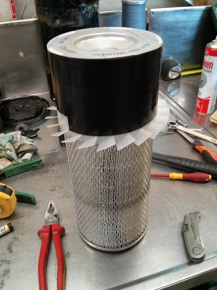 Once the intake has been swapped, the filter now has to be modified so it still cyclones. We tried prying it off but that wasn't working. After a while we cut it half way down and that gave us enough flex to slide it off. Once off we taped it up and slide it on the other end.