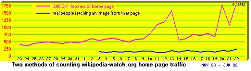 Daniel Brandt, who runs Wikipedia Watch, estimates that LinkScanner traffic to the site has outstripped legitimate clicks by nearly ten times. In this graph, the pink line represents suspected LinkScanner scans, the blue line legitimate clicks:
