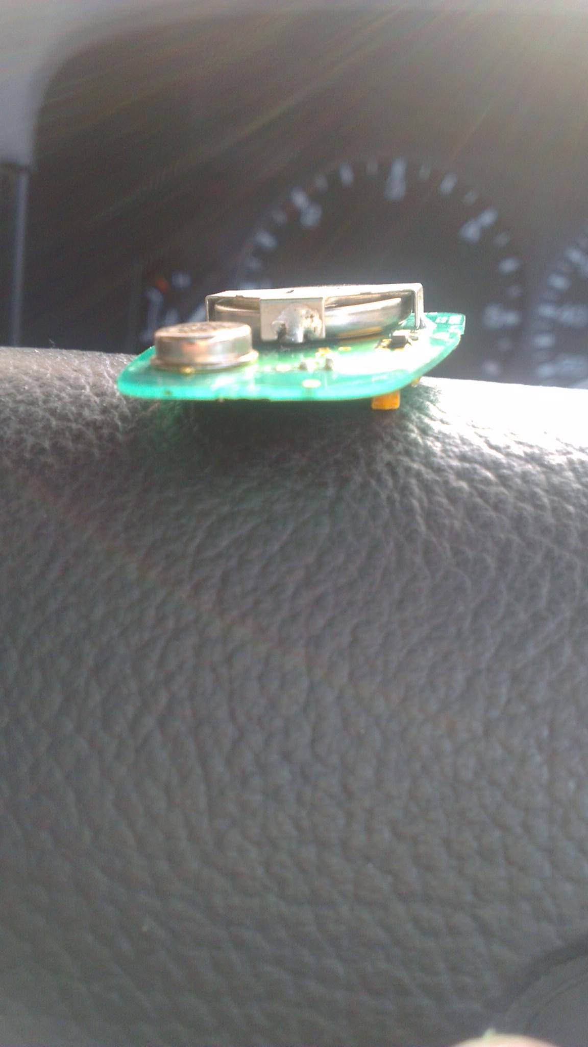 He then suggested I look closely inside the fob at the three battery points that connect the battery to the PC board. Bingo!!! This is what I found on the middle pin/pole: