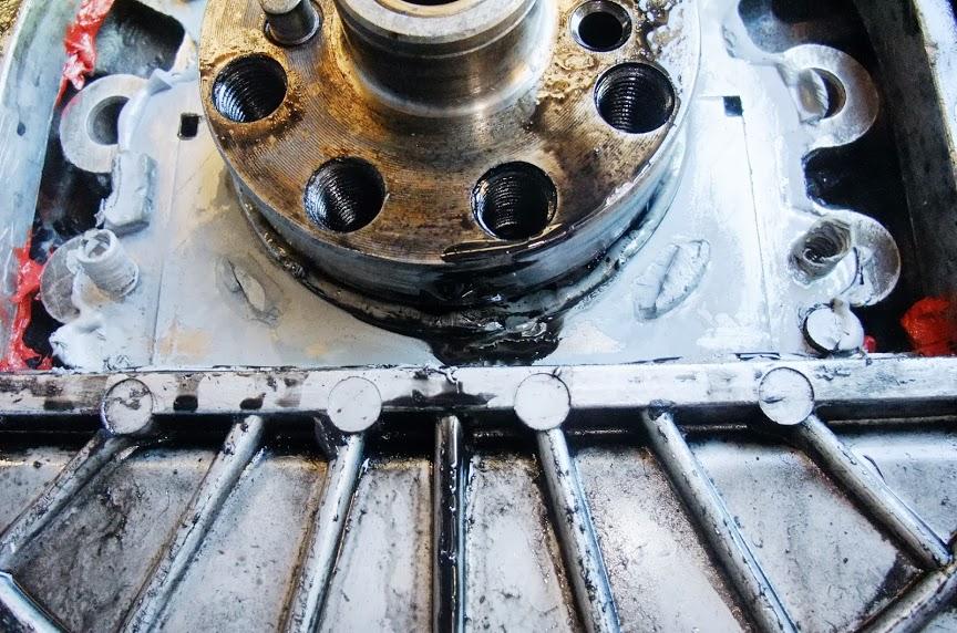 There was oil on the outer face of the crank (flywheel mating surface). Again, at least some of this oil could have dripped on the face as I removed the crank bolts, or it might suggest that oil was leaking through these threads. The outer surface of the flywheel (clutch mating surface) was dry.