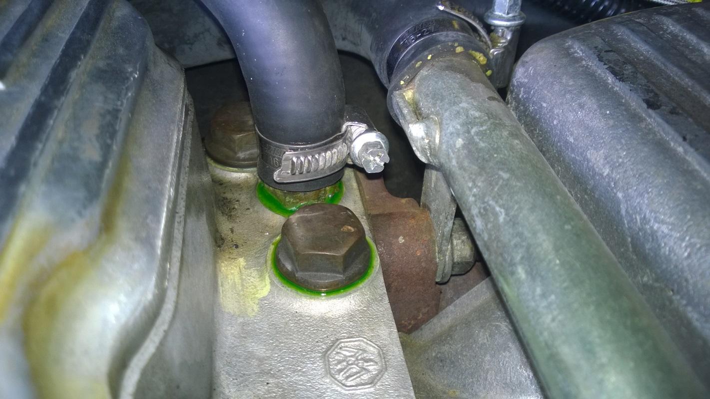As per photo, I keep having this coolant weep at the back of the 300tdi engine (heater hoses) that I cannot seem to stop. I have tightened the coolant hose (behind the bolt) but the coolant around the head bolt in front also concerns me.