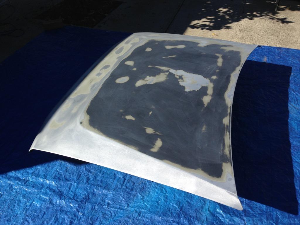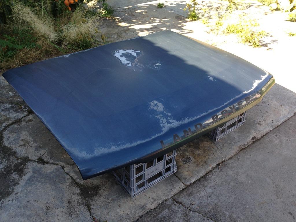 The last job I tackled was having a look at the bonnet, the reason I did was because I got three rattle cans mixed up for my a-pillar job and had load left afterwards so I though I'd put them to good use. The intention was to paint the perimeter of the bonnet in the same blue/grey as the rest of the car and have the top flatter section in Camel Trophy style matte black. Annoyingly I ran out of the paint before I got satisfactory coverage so there are a few high primer spots which came through in the final wet-sand. Oh well. that's now clear coated and awaiting the black patch which I hope to do during the evenings this week. No photo of the blue down I'm afraid.