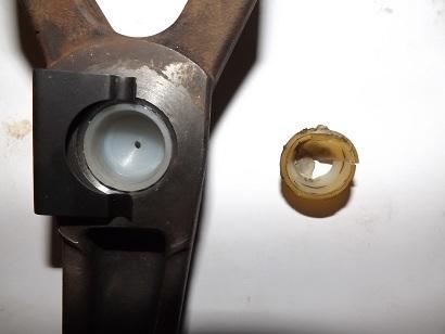 Well I have mine apart now and almost back together and I can't think what you're talking about. The fork has a metal clip that attaches to the metal pivot ball on mine ('95 manual TDI Disco). I'm no help sorry.