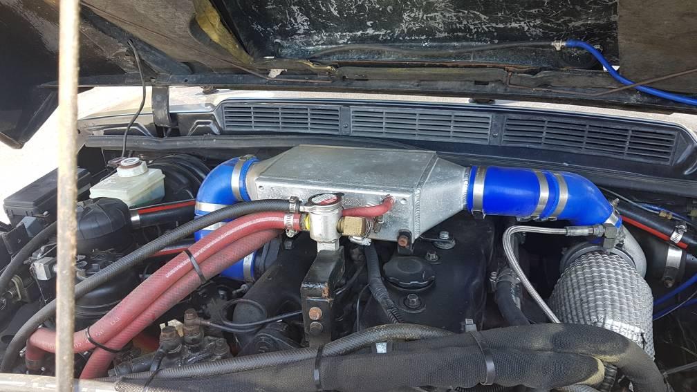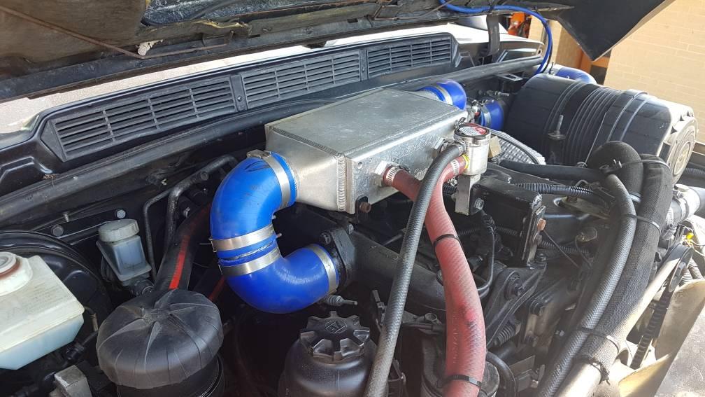 Intercooler sits on top of the motor, have a bosch electric water pump on the inner guard, and the biggest heat exchanger i could fit behind the grill.