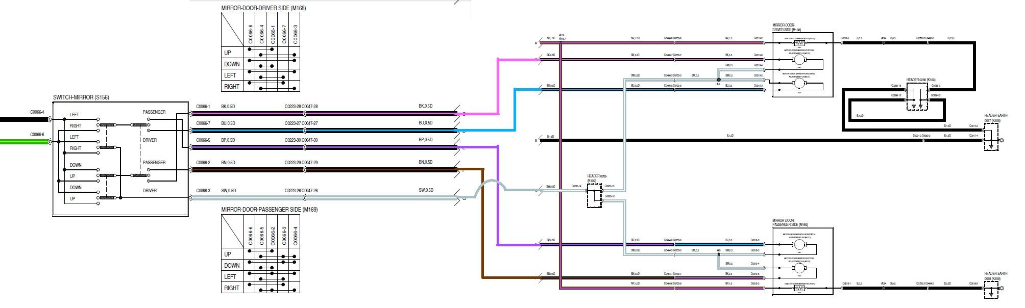 i tested all the voltages/continuity across the terminals in the multiplug and only got nomimal readings. (0.3v) so i assume there is some form of transistor setup going on inside the mirror housing....
