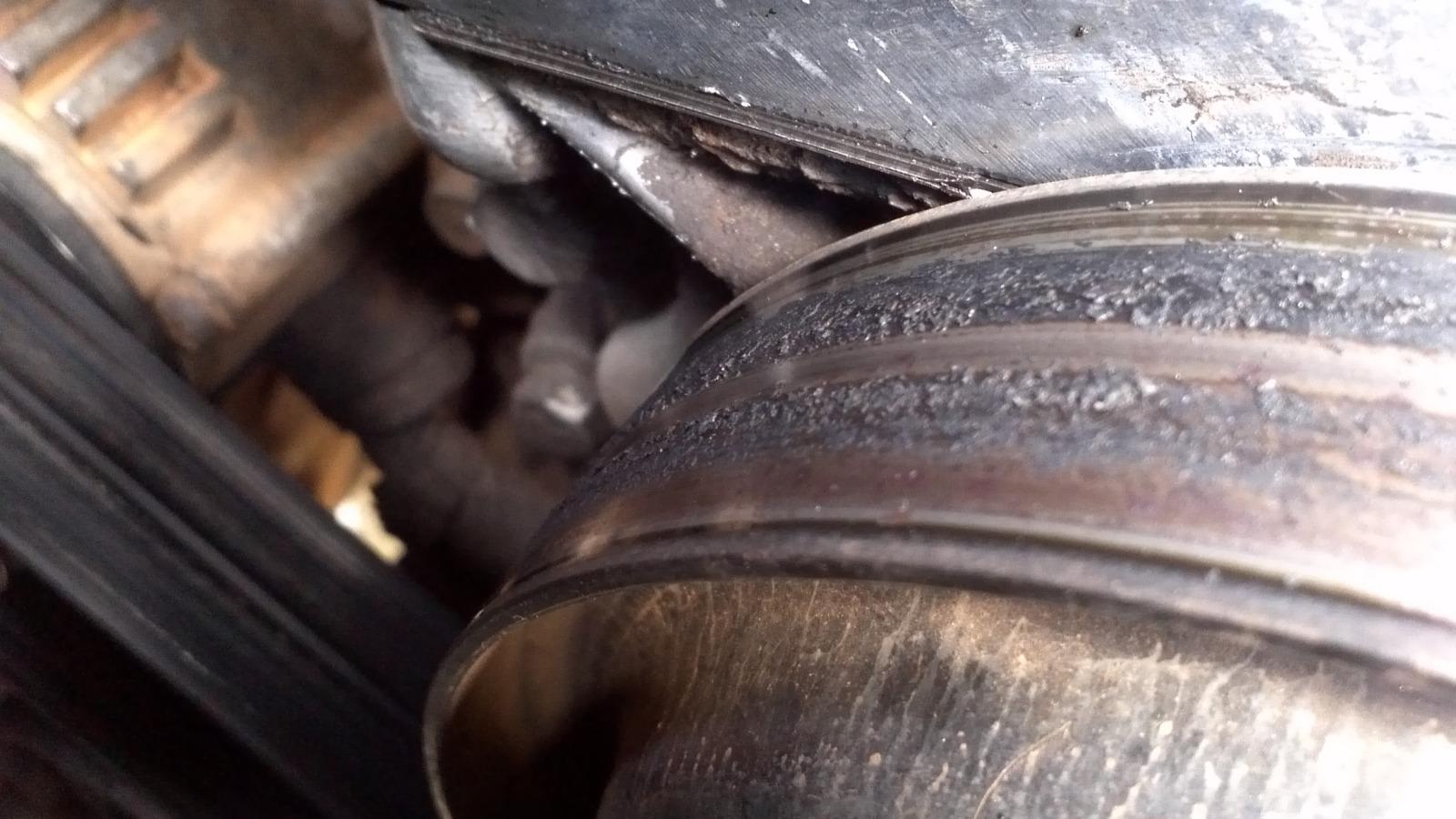 Hey So i just took a look at the drive belt and to me it looks straight as. i dont think its out of alignment and i change my mind about the tensioner too think its maybe ok. i notices the direction the rubber filings are coming from given the direction the belt runs must be coming from the fan pulley. and i noticed melted on rubber from the belt on the pulley does anyone know the reason for this (see picture.