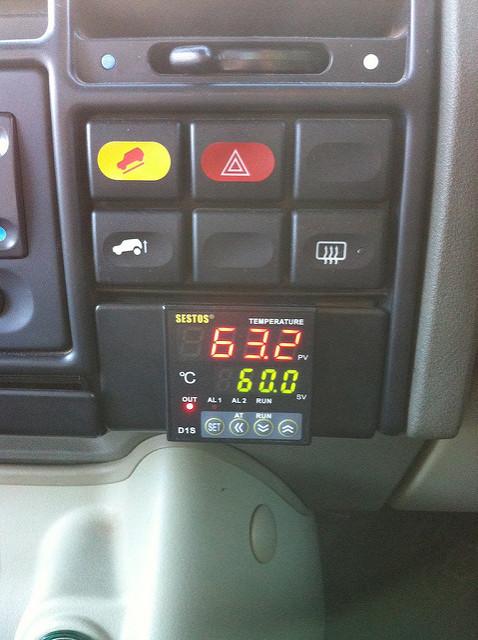 I chose this particular controller as it; displays both the actual temperature as measured on the cylinder head (in red), plus the alarm temperature (in green); the alarm temp can be adjusted easily whilst driving by simply pressing the up or down arrows; it would (just!!) fit into the ashtray.