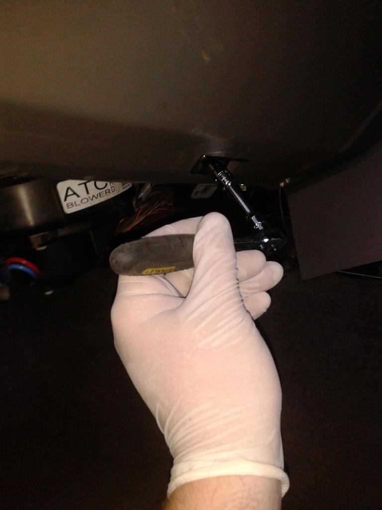 Water was dripping down from underneath the cardboard kick panel. A quick prod revealed damp sound deadening on the firewall directly beneath the blower.