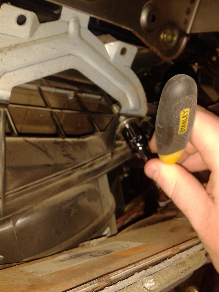 Now, remove these two top bolts holding the blower unit in place. There are also two down the bottom, including one I missed off to the far side, near the heater duct.