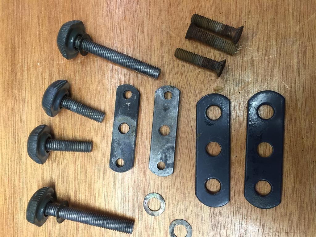 All the bits I got were rusty, so I gave them an electrolysis bath for a few days to clean them up. From that, you can see the mounting plates are just mild steel, and they look to just be flat bar that has been cut with the ends rounded over by hand (as they are not symmetrical), with holes drilled and tapped. The bolts I had again, don't appear to be high tensile and the guy at the nut and bolt place agreed.