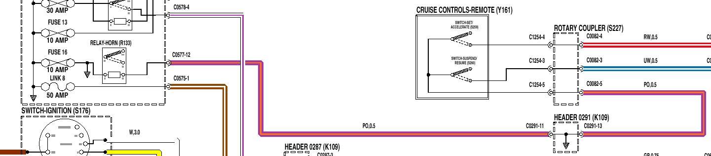 Actually the CC is picking up a reduced feed through the horn relay's coil and as you described it your problem is within that Header which for RHD is C0286(your diagram with 0291 is for a LHD vehicle) cos by connecting directly the coupler to the fusebox the CC switch is getting that voltage through the relay's coil...provided the diagram is good cos it's very strange thoughOriginally Posted by Slunnie