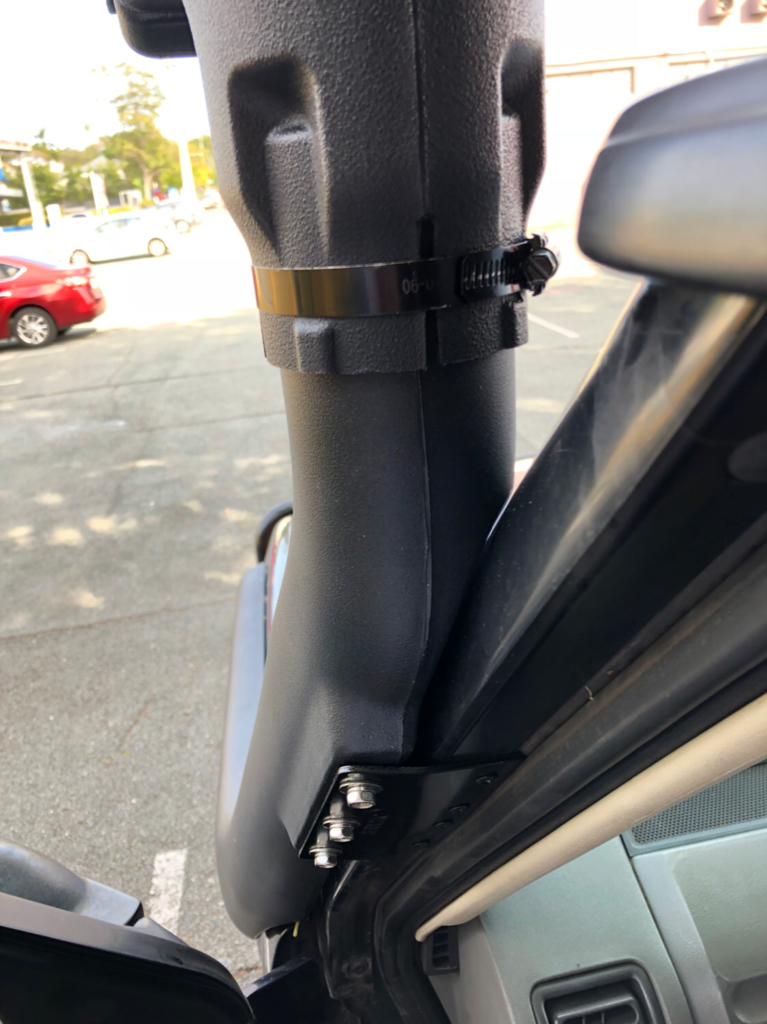 My snorkel is identical, if you you look at the pictures on various sites they all have the same number "cast" in them, just sold under different names. I had the same problem with the inlet lining up, i even trimmed the cast down with a grinder for it to fit better but just doesn't quiet line up. The A pillar support on mine was fine though, fitted tight and the bracket was flush with the pillar, you might have needed a bit more fiddle factor with your holes to get it to line up better, the hole sizes are big compared to the stud sizes. My duckbill was deformed and didn't seal up normally, so just silicon it shut, others have fitted a blanking plug so you can't suck water in if submerged on a creek crossing. Don't forget to seal the guard to airbox joiner pipe.