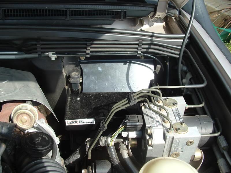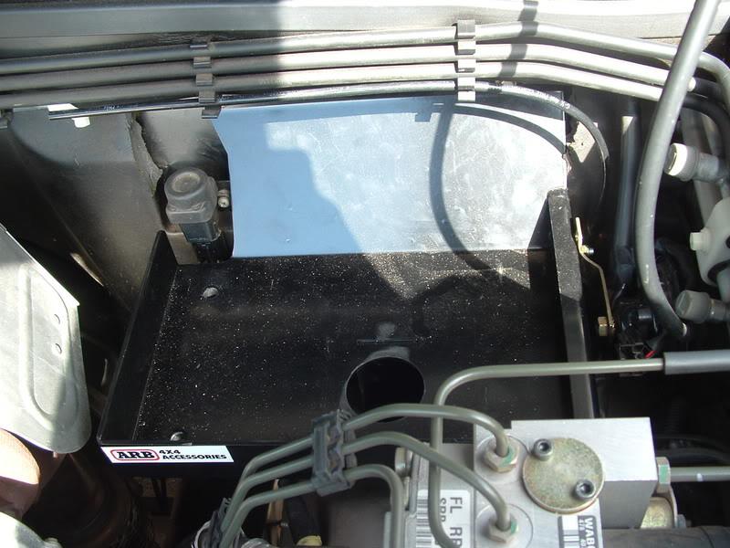 Down next to the SLS compressor is where I have my second Aux Battery mounted. I have it dedicated to run the fridge and the smaller Aux battery on the ARB tray under the bonnet runs lights, stereo, UHF etc. I mounted it there as I have no room in the back (cubby boxes) as its a seven seater and I didn't want to remove a seat.