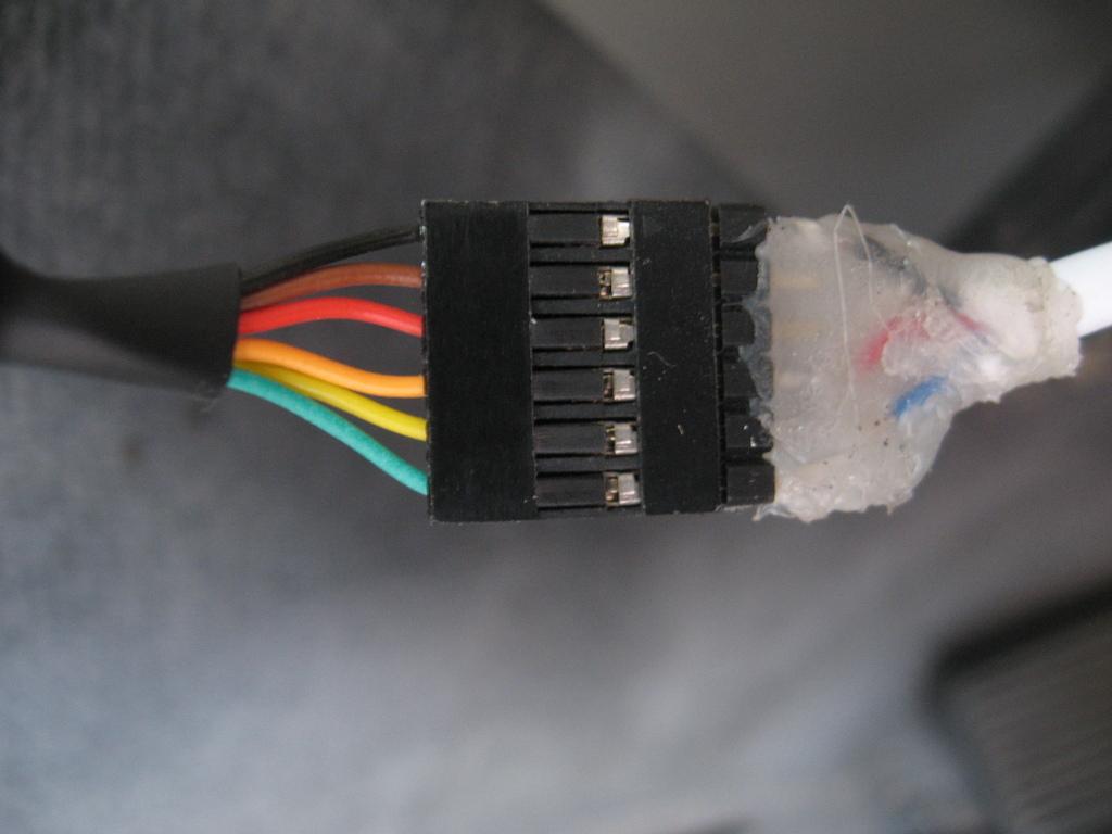 Note the thinner wires (black, blue and red) from the phone cable. I just soldered them onto the existing crimp connectors.