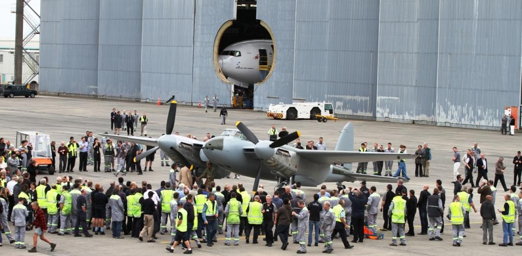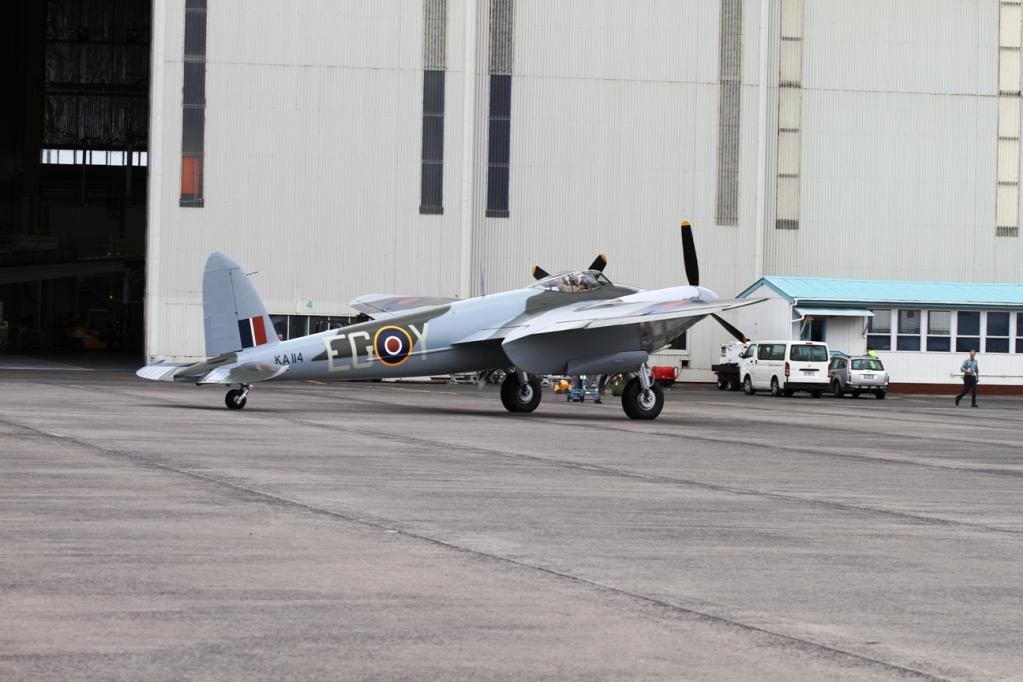 Tech Ops' Auckland base saw a world first today, welcoming the world’s only flying Mosquito on its maiden flight from Ardmore aerodrome. Most of Tech Ops Auckland personnel popped out to see the Mosquito land, escorted in by a Trojan and taxi onto the Tech Ops hardstand for a quick checkover.