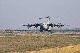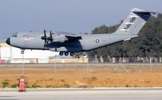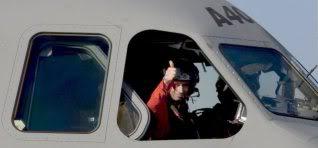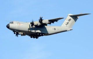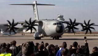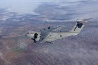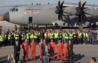 Spanish pilot Ignacio Lombo gives a thumbs up from the cabin of the European military transport Airbus A400M, after landing at San Pablo aerodrome in Seville, southern Spain, 11 December 2009, following the maiden flight. The plane, built by European EADS, is part of a 20 billion euro project threatened by soaring costs after a two-year development delay. After running its four TP400-D6 turboprop engines for several minutes, the A400M taxied towards the runway and took off. On board the plane travelled captains Ignacio Lombo of Spain and Edward Strongman of the UK and four French engineers