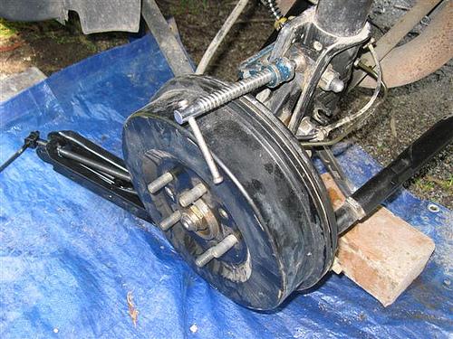 Brake lines run through a bracket welded to the rear struts, so undo the unions and fit the new lines, but leave them assembled outside the bracket until you get the struts back in. Then fit the lines where they belong and bleed the brakes.
