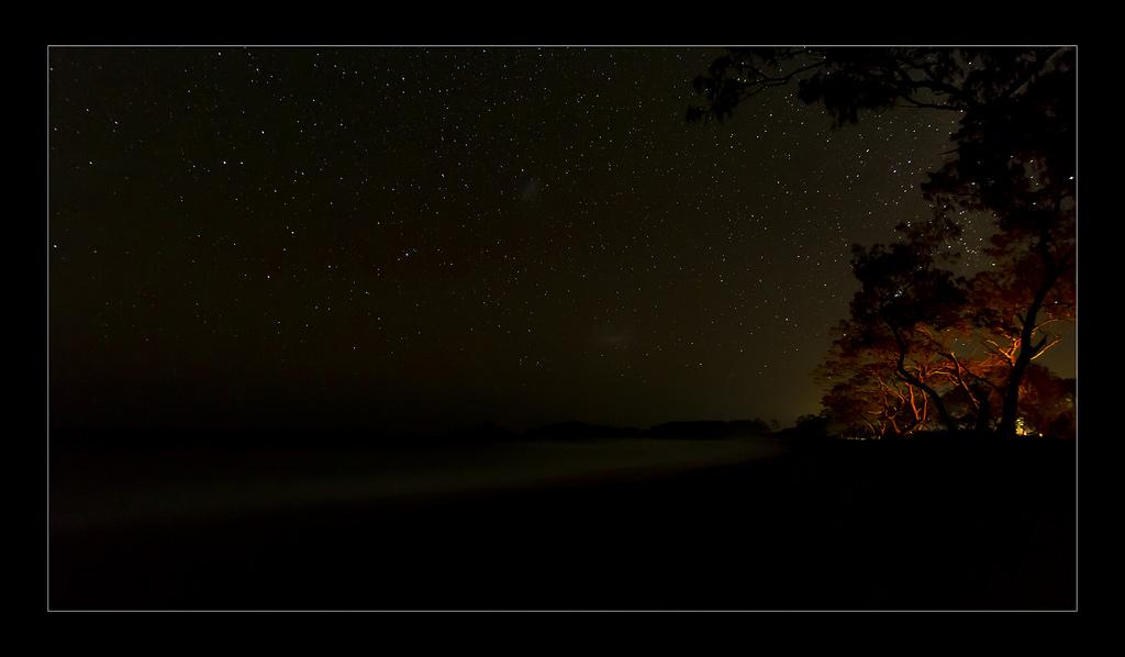 Star trails on Friday night.  The camera is on the beach and the glow in the trees is our camp fire.