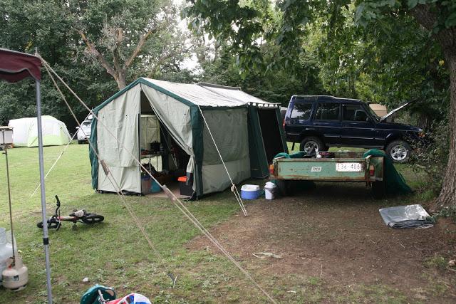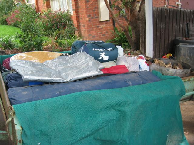 . Trailer was reasonably full but also had about 100kg of firewood and an old 7kg w/machine drum for a fireplace. We packed - an 8x10ft cabin tent with additional sunroom, large inflatable mattress, camp bunks for the kids, 4 sleeping bags, 3 additional blankets, 9 and 2kg gas bottles, 2 burner stove with stand, large moulded plastic folding table and smaller folding table,roll of carpet for sunroom floor, 3 way fridge, picnic basket, large plastic tub of food, large tub of cooking utensils, large tarp in case of rain, 4 cases of clothing, 1 L duffel bag of towels etc, 2 bikes, dog food /bowls, 10l of water (drinking) ,lpg lamp and 12v versa light.