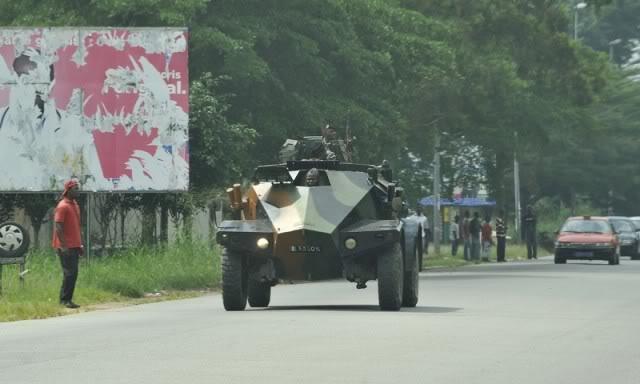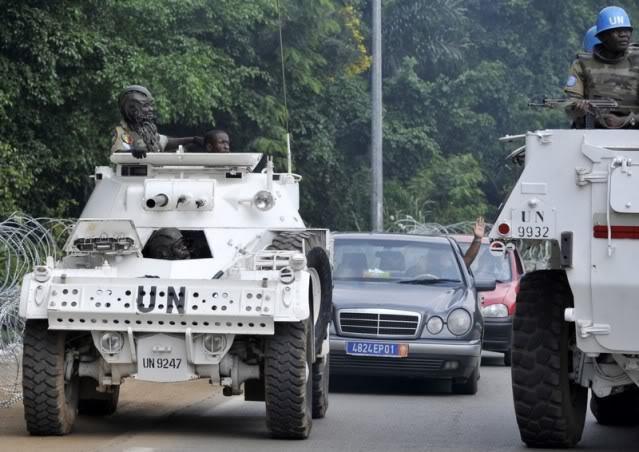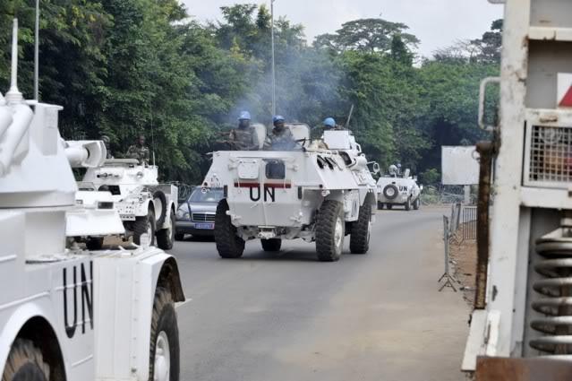 United Nations peacekeepers patrol on December 13, 2010 around the Golf Hotel in Abidjan, where Alassane Ouattara set up his headquarters. Troops loyal to Ivory Coast leader Laurent Gbagbo deployed around the hotel housing his internationally-backed rival, as the European Union planned sanctions against him.