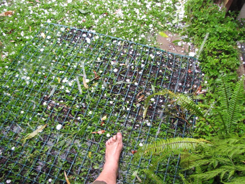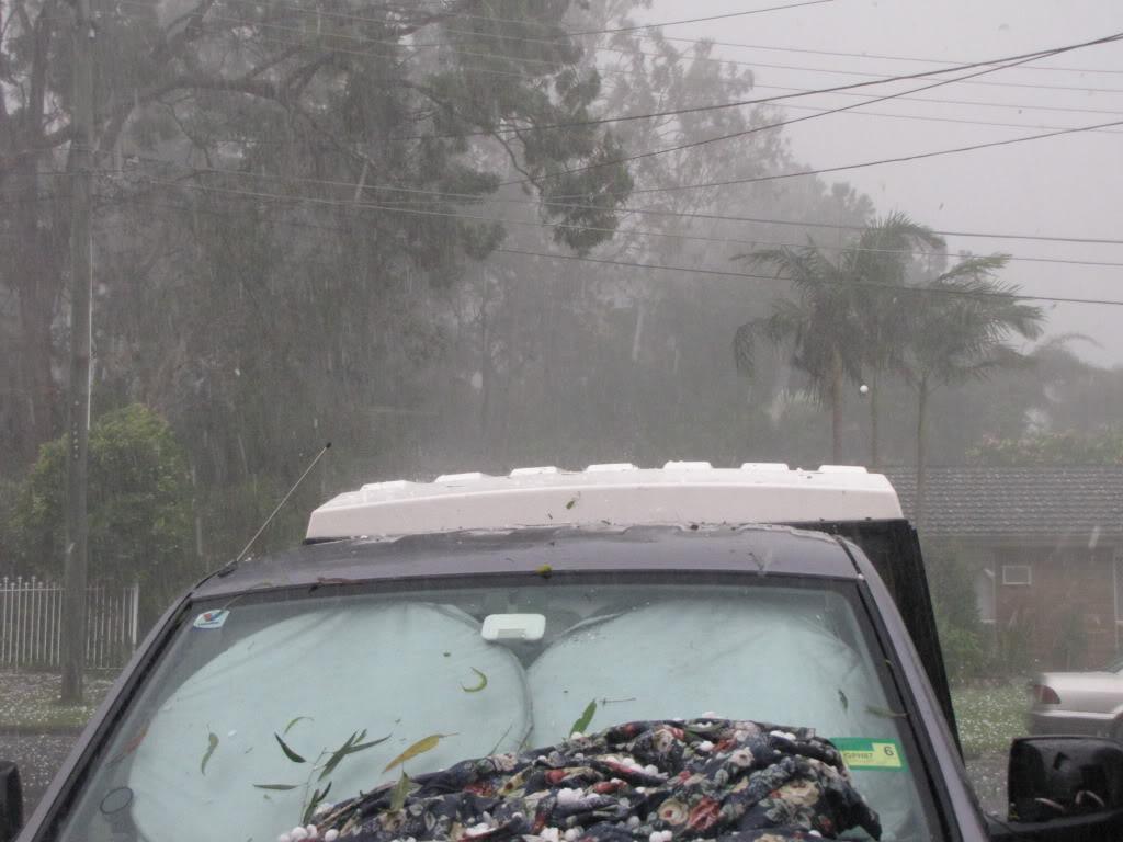About the second hail stone hit the mirror on the ute and "unclipped" the mirror housing! By the time we realised how heavy the hail was there was no way I was going out into it to cover the rest of the car!