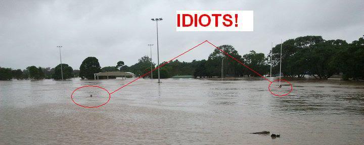 Self explainitory!!!!! ... Further proof why Bogans and Morons shouldn't breed! The bloke on the left was panicing as he was being swept away, but did eventually make it back to dry land while his bogan mates were laughing at him and calling all sorts of colourful names! ... the other bloke ended up perching himself on the cross bar of the footy goal posts, with the water lapping at his feet as it gushed on by! ... Gives you some kind of perspective as to the depth of the water!