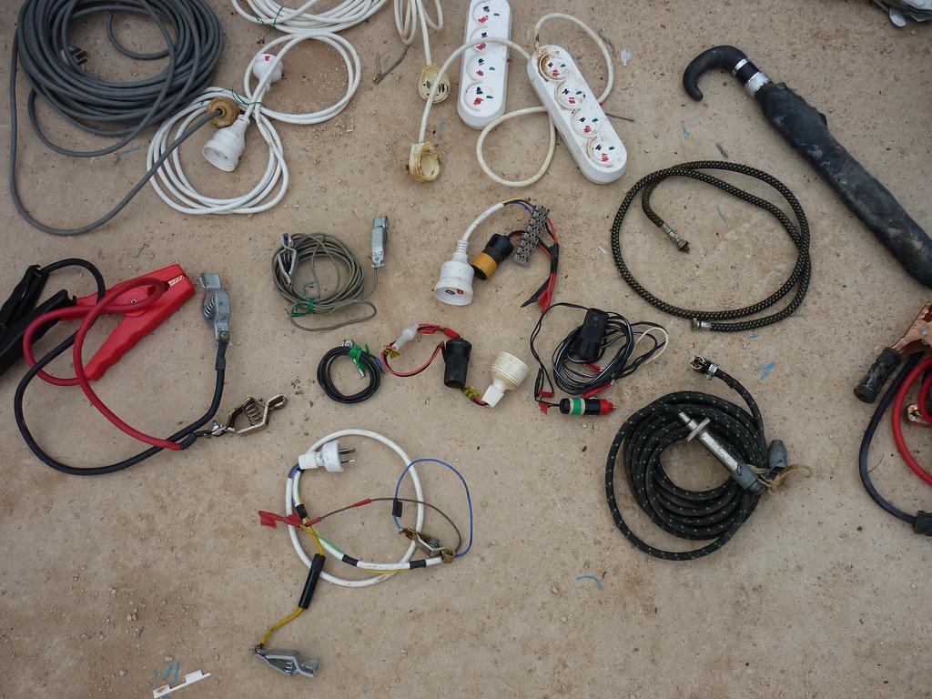 A mix of standard extention cord and power boards, modified bits of wiring and also a "spark plug tyre compressor" cord