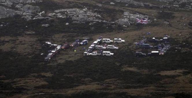 At least 30 Land Rovers were lined up to spell "YES" on a patch of land opposite Stanley that has historically been used by Royal Navy vessels to commemorate their vessels.