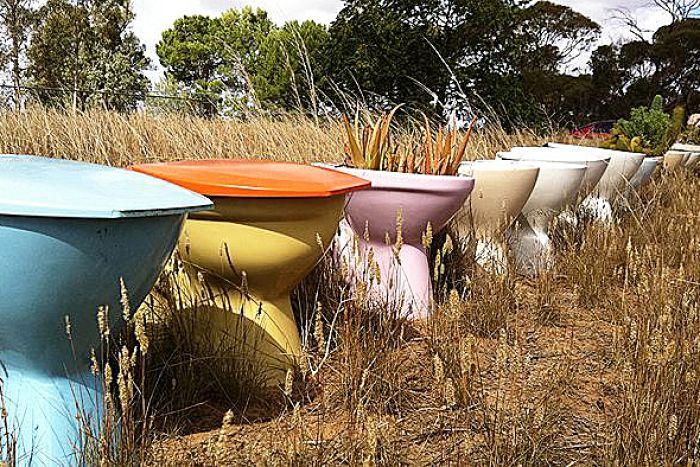 Photo: Eye-catching old toilet pans displayed between Bute and Port Broughton are not much use to anyone caught short (ABC: Ann Jones)