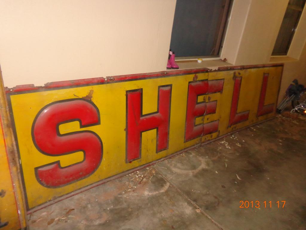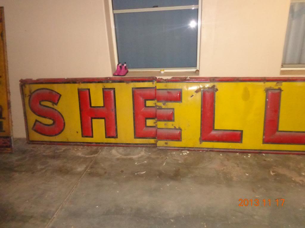There are two shell signs, both have a small amount of relief in the lettering and a red raised and rolled ( 1/2 round ) border... They are two part signs. I believe either side of a rooftop sign maybe?? About 8' -10' when set up??