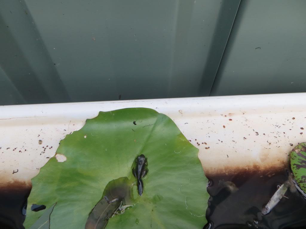 A little while back we noted some frogs eggs on the edge of the tub so we decided to let them be and see what happened. (I remember doing the same thing when I was about 10 or so.) These eggs have duly hatched into a myriad of tadpoles and over the past few days we have been witness to the evolution of these little critters into frogs.