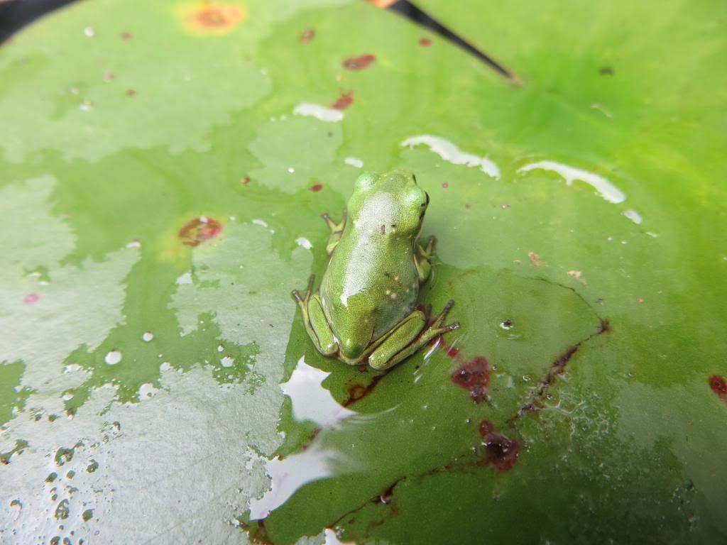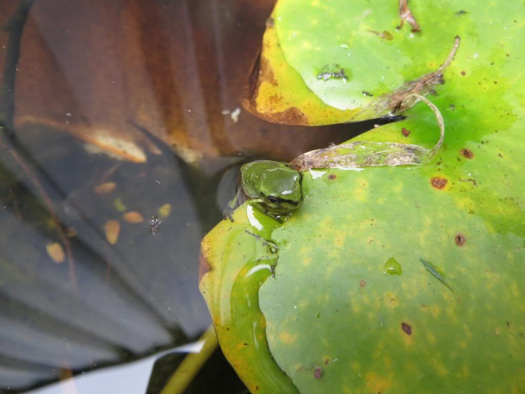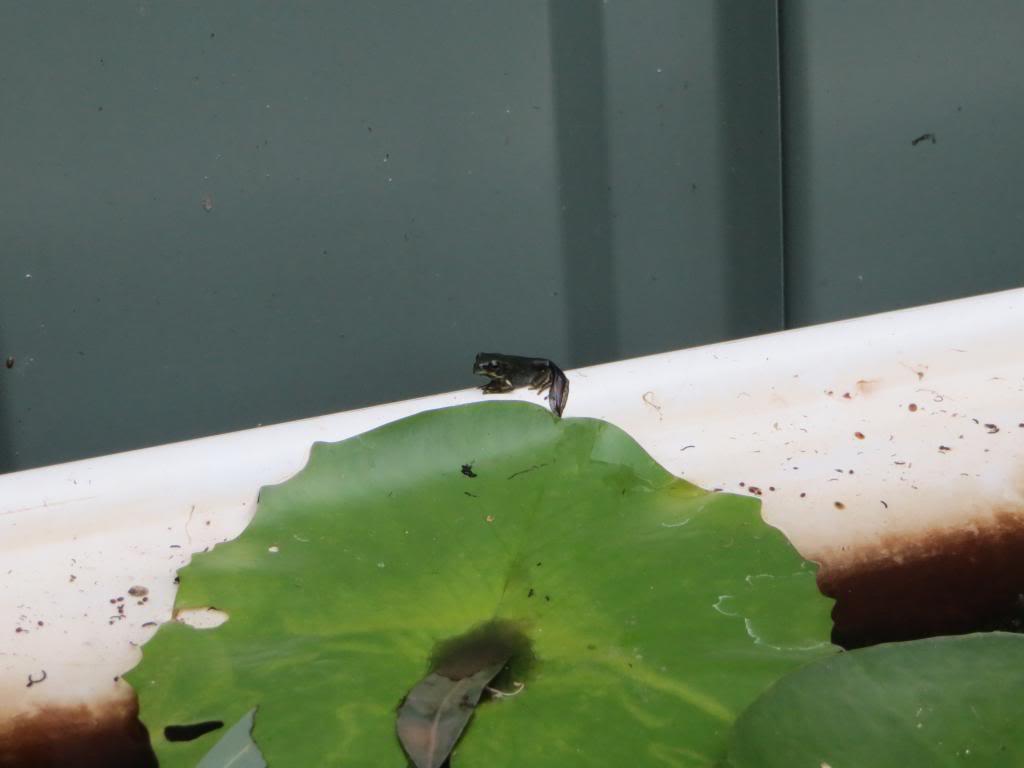 He/she left the pond about 15 minutes after this shot by jumping on to a green pot plant about a foot away from the tub.