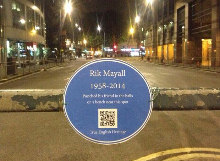β€œRik Mayall 1958-2014 Punched his friend in the balls on a bench near this spot,” the plaque said.