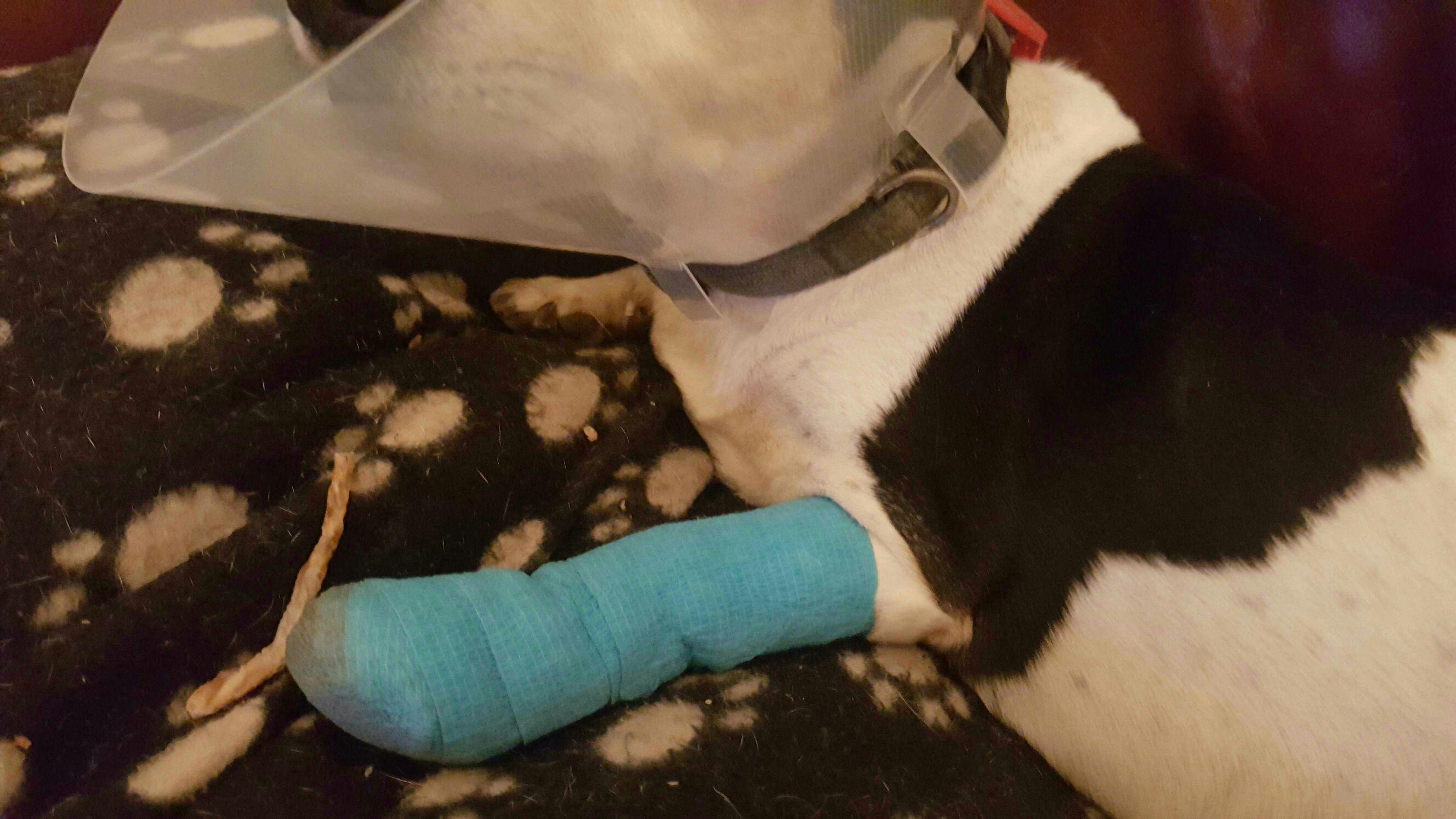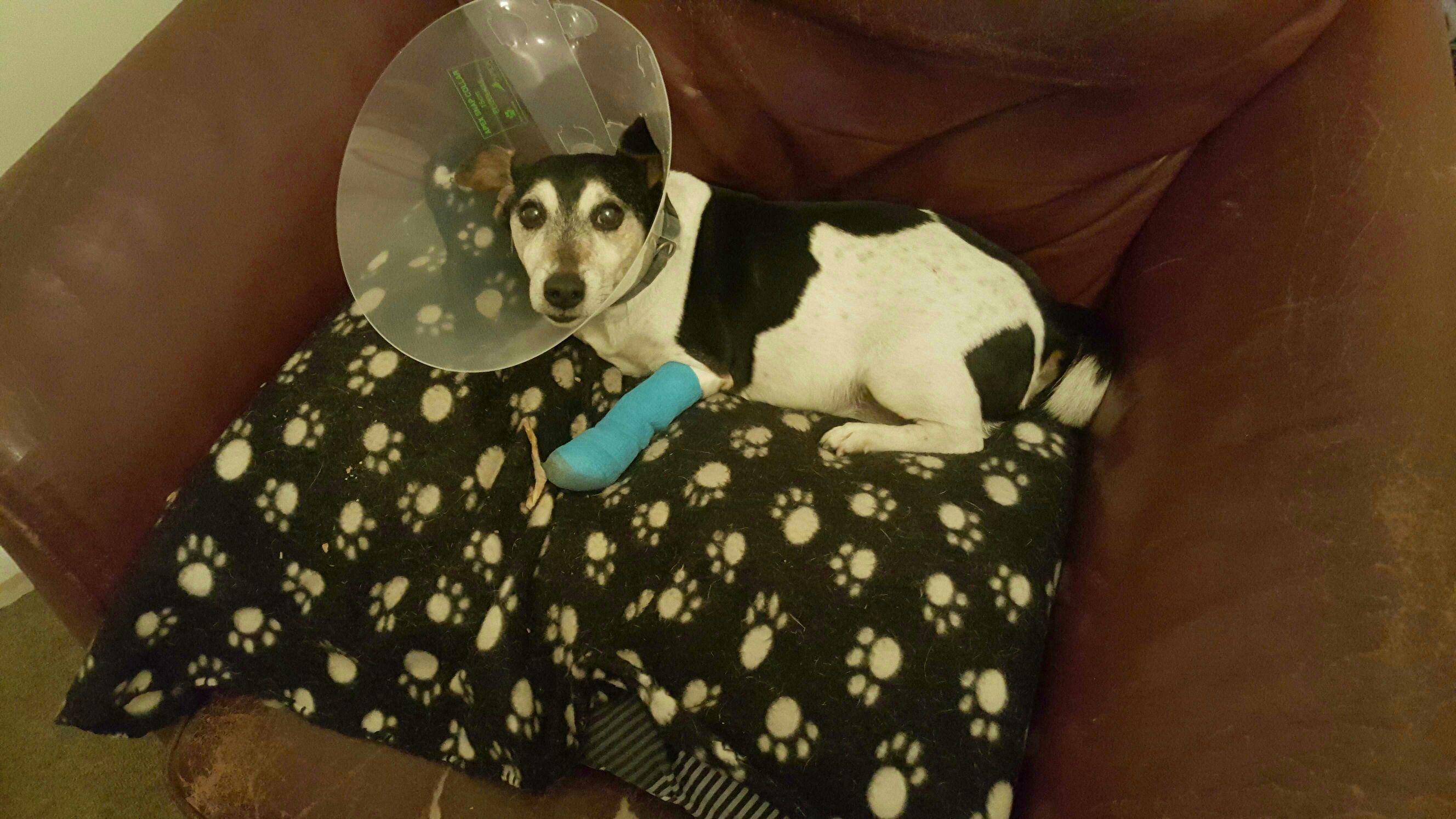 So snoopy had another trip to the vet tonight. As he jumped out of the car, his left front dew claw got caught up on his jumper causing it to break off and bleed a bit. So the vet snipped it off. The claw will grow back aparently. Now hes got a blue foot and the cone of shame...Show us your ...........DOG Show us your ...........DOG