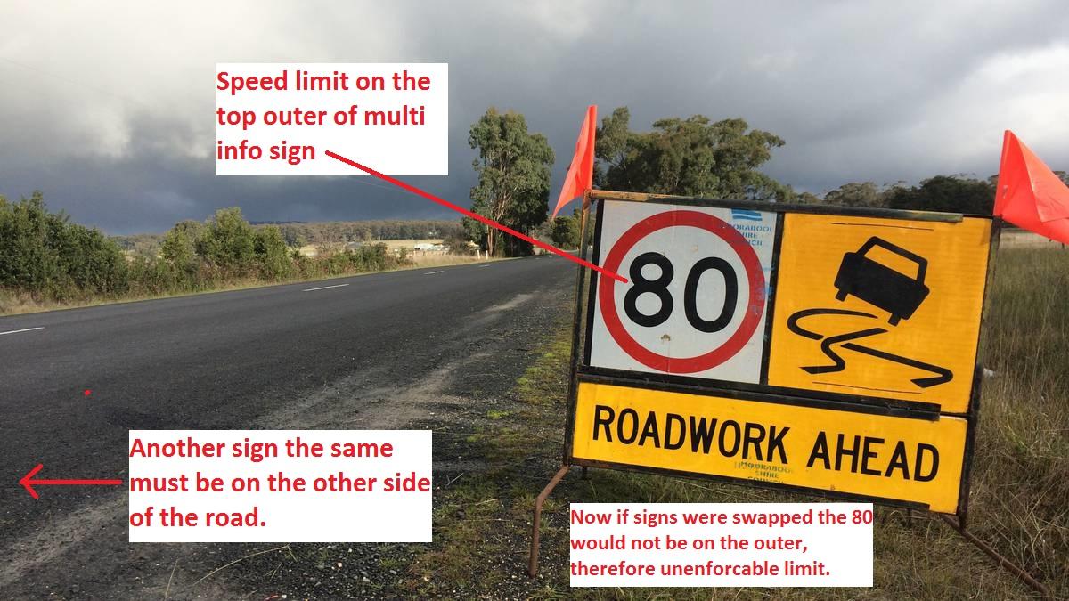 This also includes road work speed limits. And if the road work sign is a multi information sign, the speed part of the sign must be at the top and closest to the road.