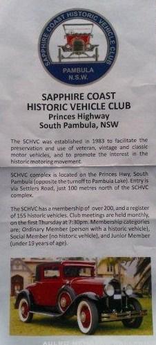 I googled 4 coraki drive and came up with Pambula. Then googled Historic Vehicle Clubs Pambula and came up with Sapphire Coast Historic Vehicle Club. 4 Coraki Drive is on the garage sale sign under one of the vehicles.