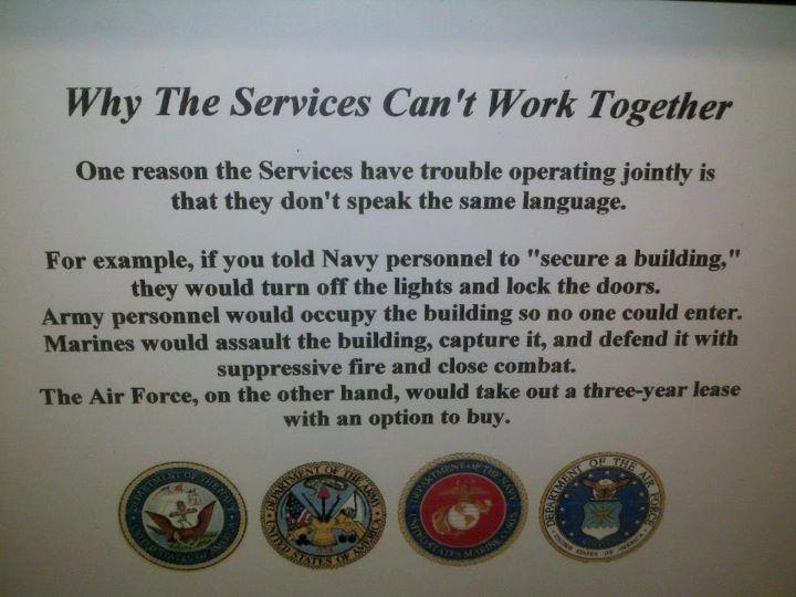 9. Land, sea and air ? we fight everywhere. Unlike the other services, the Navy is equipment driven. We may rib each other about whether surface, air, subs, SEALs, supply, etc. are the best part of the Navy, but in the moment of crisis we got it all.