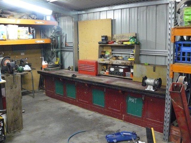 I scored this up on the weekend... What a PITA ... I managed to back the car trailer under it after slinging it from the middle to lift it with an engine crane (it's VERY heavy) ... Then I did the same thing to get it off in my shed ... The bench top is about probably 4" thick with a plywood top sheet (I guess the idea is you change the top sheet as it gets battered).