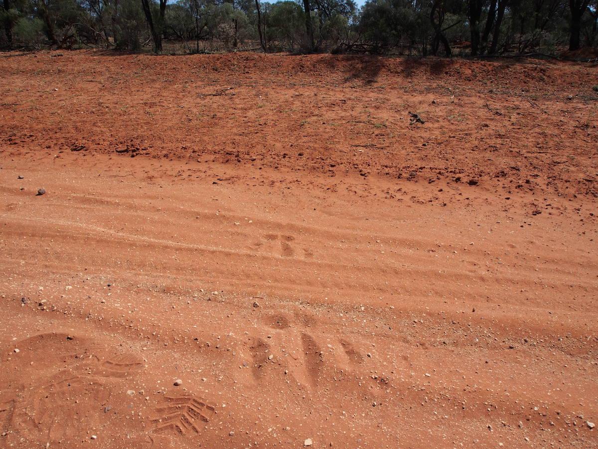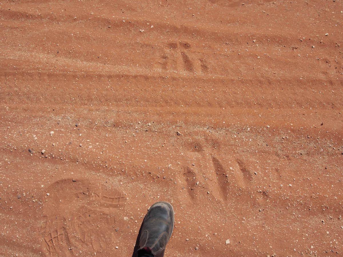 On the Wanaaring - Bourke road today, stopped to take a Lizard photo and saw these, my size 10 boot for reference. only the two footprints visible , rest may have been obscured by traffic