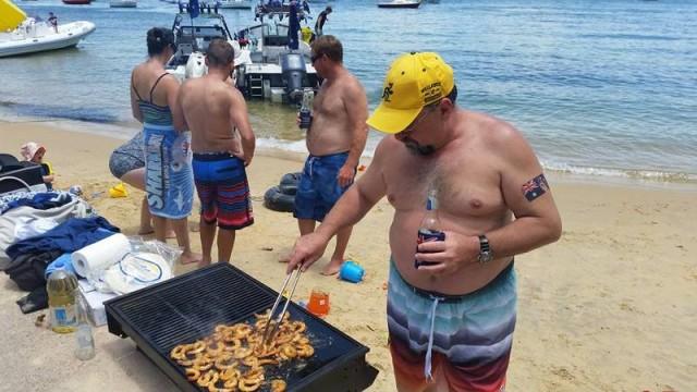My neighbour and his family and friends and my lot take our boats out on Sydney Harbour, decked out in Aussie flags and head over to Watson's Bay where we anchor just off shore, atke the BBQ up on the seawall and cook prawns, Lamb Kebabs and Lamb Cutlets washed down with a few bevvies.