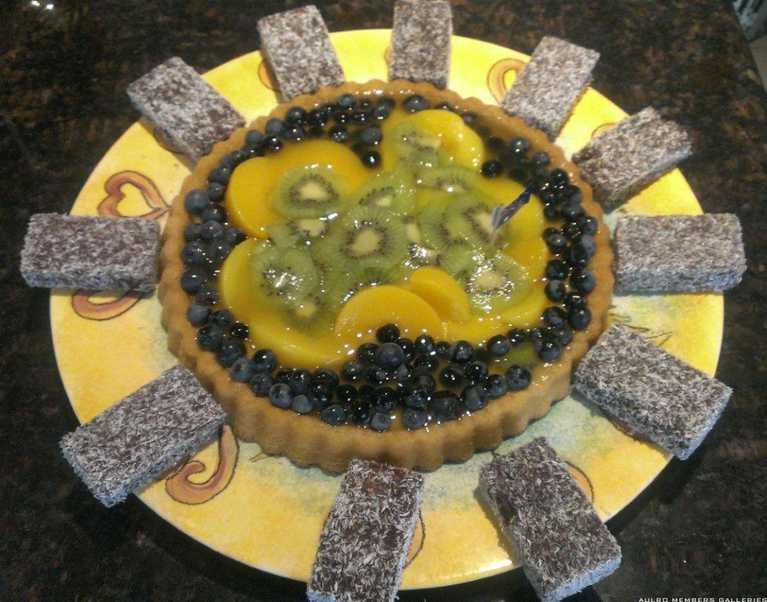 Had 20 friends around for a long lunch - two butterflyed legs of lamb on the barbie & a few kilos of snags with mixed herbs in the large camp oven plus a few salads, followed by a large pav & a fruit flan in the form of a map of Australia, girt by sea.