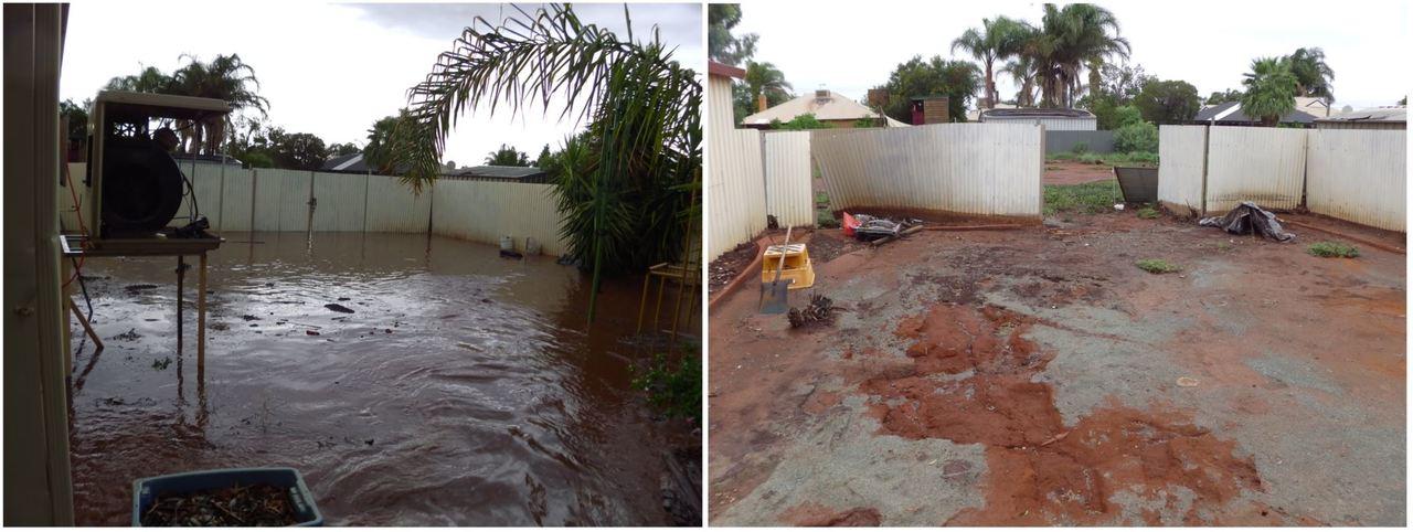 So - the photo on the left below shows the young bloke's back yard last time it flooded (was still daylight). Last night, it got considerably higher than this - and the back fence ended up letting go as shown in the photo on the right.