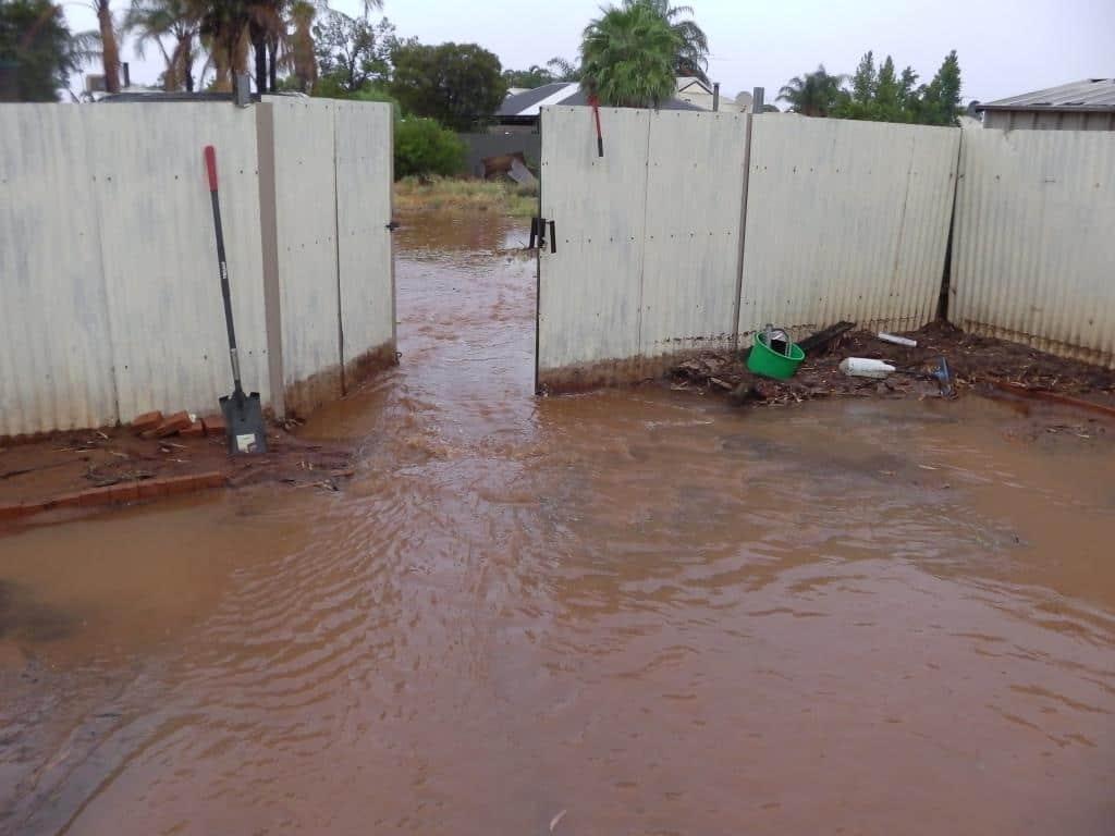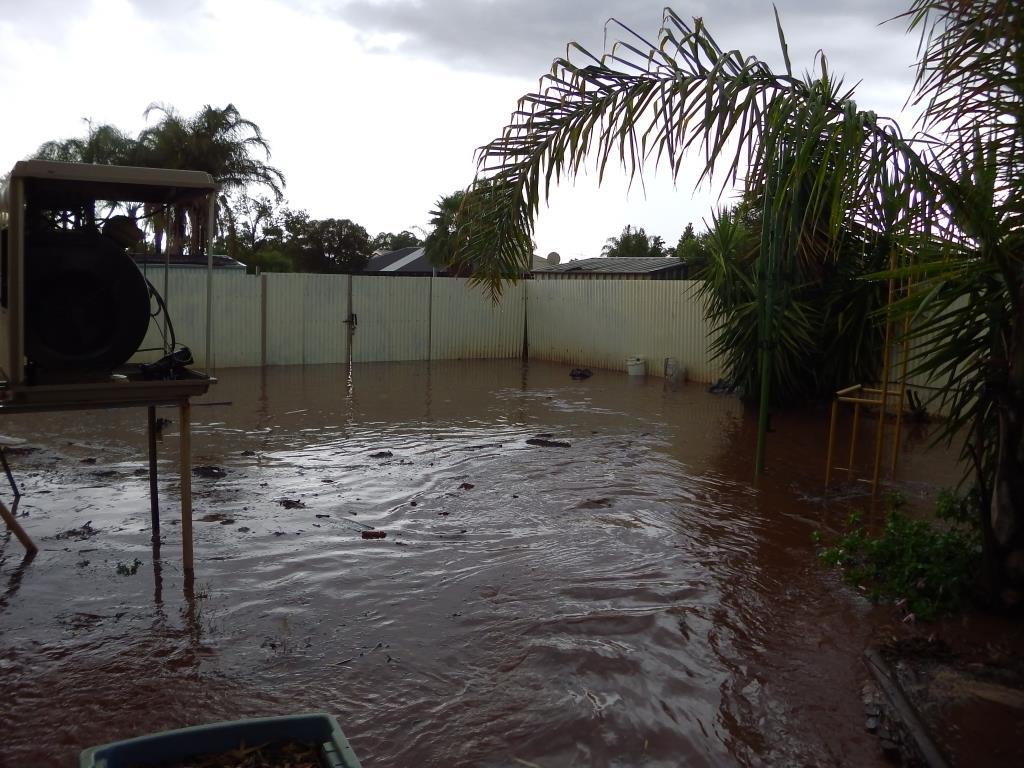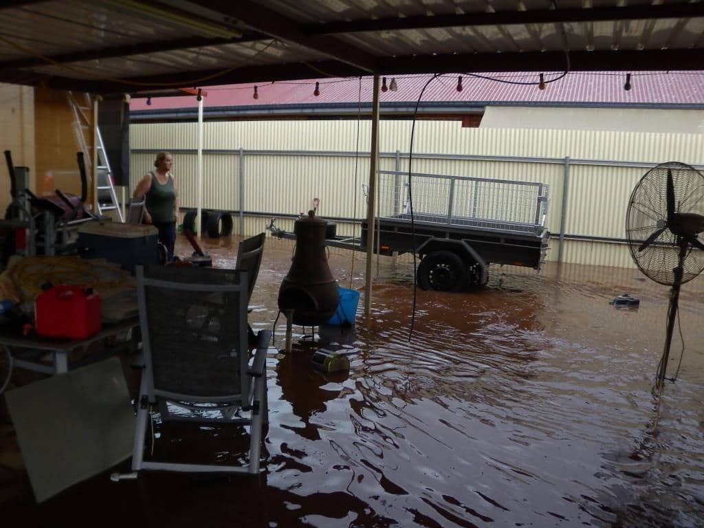 Water was banked up against his roller door, so I opened it up and there was then a river flowing down the side of his house through the carport and into the back yard, where it was again held up by the back gate until I could cut the chain (couldn't find the key to the padlock) and open the gate.