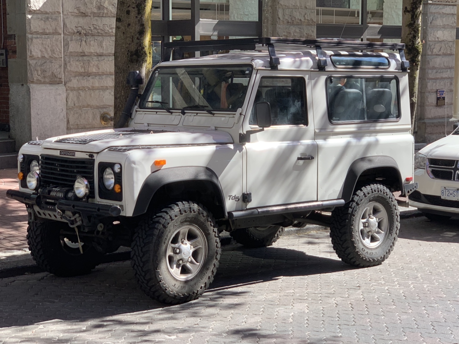 Interesting as it has provisions for branch wire slides from bonnet to roof, and what I think might be like a cargo type net arrangement on the bonnet. But what was the little black thing right at the front on the right side of the Defender name?