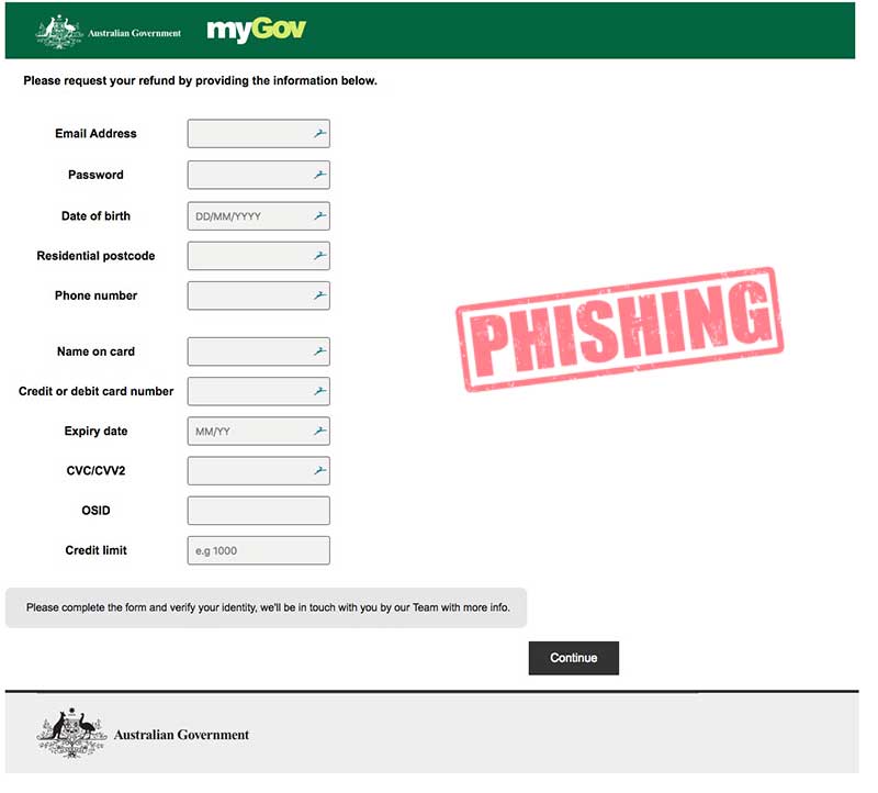 The form asks for your name and contact details, your myGov password and your credit card number. After you supply this information and click the ‘Continue’ button, you’ll be automatically redirected to the myGov website. By then it’s too late and the scammer has your details.