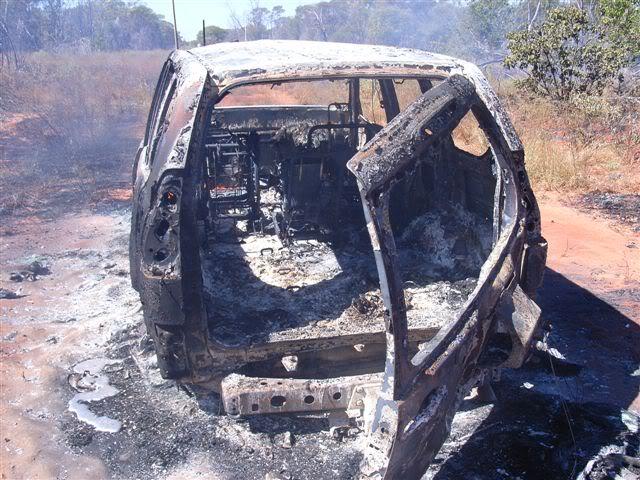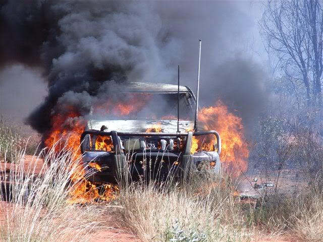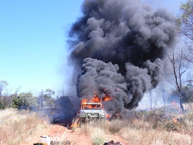 Spinifex does tend to burn with black smoke, but it must have burnt through a fuel line early on - which then siphoned fuel into the fire. Had the same thing on an FJ40 when I was working in the Simpson forty years ago. (didn't start from spinifex - started by a petrol leak plus smoking, but was impossible to put out once a fuel line burnt through)
