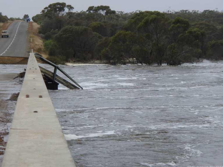 SW Hwy at Oldfield River, just west of Munglinup. Still 800mm of water flowing this morning. Usually no flow at all this time of year. Usually mor like a creek.