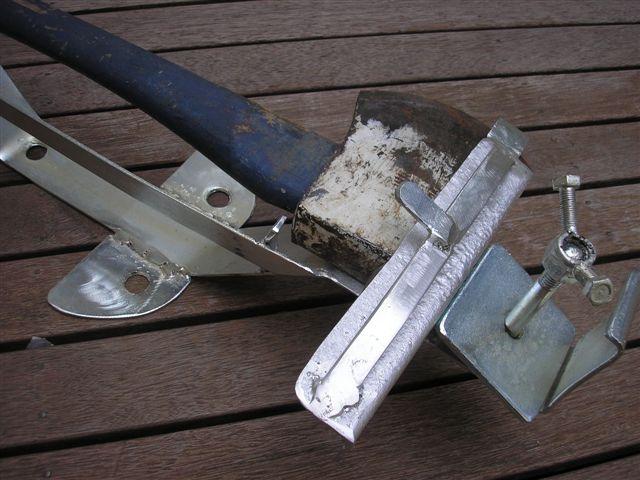 Theres a cradle at the bottom for the axe head and it must go in on an angle, then sit upright, that way it can't jump out of place. The shovel slides in in front of the axe, the pick/mattock handle slots in behind the shovel and beside the axe. There's a cradle / recess at the bottom with a bolt welded on where the mattock head goes and then a large washer & wingnut hold that into place.