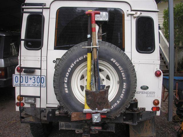 I made one for the defender that bolts onto the Kaymar rear wheel carrier. It carries a shovel, an axe and a pick.